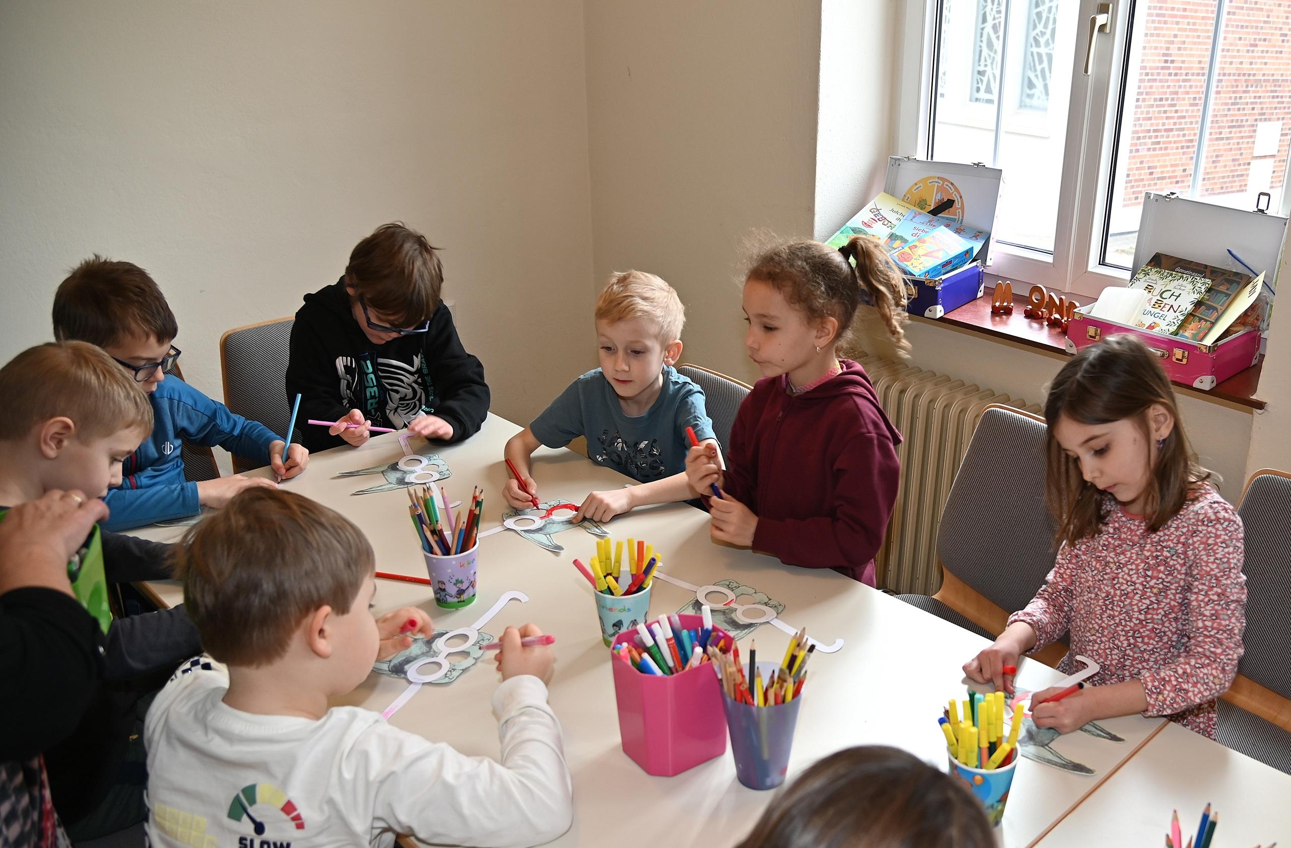 Nach der Begrüßung und Vorstellung der Bibliothek Generationentreff - der Bibliothek für Jung und Alt - wurde den Kindern die Bibliotheksordnung erklärt: die Öffnungszeiten, die Dauer der Entlehnung, die kostenlose Entlehnung der Kinder, die Medienvielfalt und die Ablage der Medien. Das Buch der kultivierte Wolf wurde vorgestellt und als Bilderbuchkino gezeigt. Danach wurden Brillen gebastelt, gleich denen die von den kultivierten Tieren auf dem Bauernhof zum Lesen verwendet wurden.