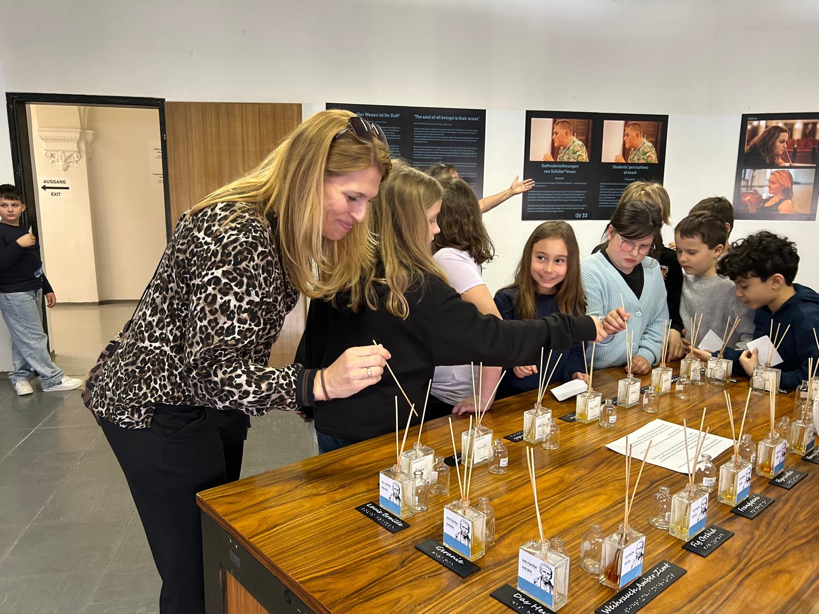 In Gruppen aufgeteilt und von blinden Jugendlichen geführt durften wir in einer Dunkelkammer verschiedene Gegenstände ertasten, außergewöhnliche Düfte riechen, Blindenschreibmaschinen ausprobieren und blinden Kindern beim Arbeiten am Computer zusehen.